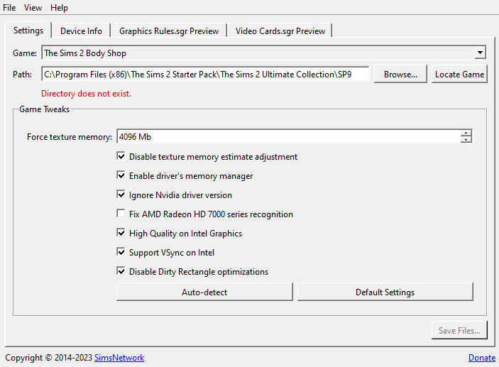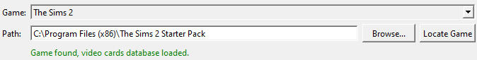 In the "Game" dropdown menu, select "The Sims 2".In the "Path" menu, make sure the path is set to “C:\Program Files (x86)\The Sims 2 Starter Pack”.After this, it will say that the game has been found, and that the video cards database has been located.