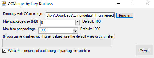If you find that you have downloaded tens of thousands of files and your game is running slower than ever, you can use this tool to merge your custom content.It should not go in your downloads folder.If you had 100 files of just lipstick, it can cut it down to only a handful of files. The game doesn’t necessarily read how big the files are when deciding how long it takes to load, it usually reads how many files there are. So, cutting down on the amount of files will make for a faster loading time, even if you have several GB of cc.To use it, open the application and click “browse” to find the folder of the custom content you want to merge. This is why I separate my different types of custom content by folder, as it makes each type of custom content easier to find, and it means that the merger will not accidentally include any other folders when merging.