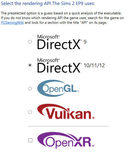 "Microsoft DirectX 10/11/12"If you DO have DXVK, you will want to choose: