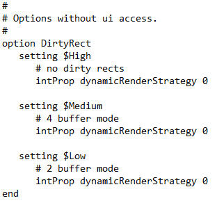 seti High 3"If it looks like that, edit the text in the file so that each of those lines has a 3 at the end of it. It should appear as listed above when you are done.After you have confirmed this change, Ctrl+F and search for "option DirtyRect". It should look as pictured here.If each line does NOT have a zero at the end of it, make sure you change it so that it does have a zero. After this, you are done with the file. Make sure you save your file before closing it.