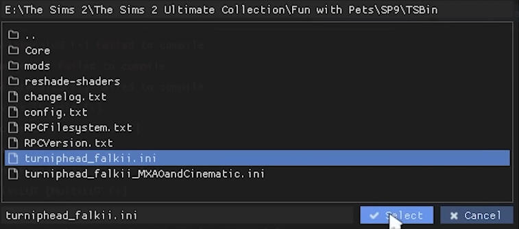 After you press "Next", Reshade will install, and then you can hit "Finish" when it is complete.Before you start your game, you will want to locate a file in TSBin called "dxgi.dll". Once you've found it, make sure you have file name extensions turned in in your file explorer (click "view" at the top of the page and select "file name extensions"). Then, you will want to rename "dxgi.dll" to "Reshade.asi".Move the newly-renamed "Reshade.asi" to the "mods" folder in TSBin. If you do not have this folder, you should create one.Now you should go to your Config folder (Located at "Program Files (x86) / The Sims 2 Starter Pack / Fun with Pets / SP9 / TSData / Res / Config") and open Graphics Rules.sgr with Notepad.If you increased resolution as instructed before, your file should have: