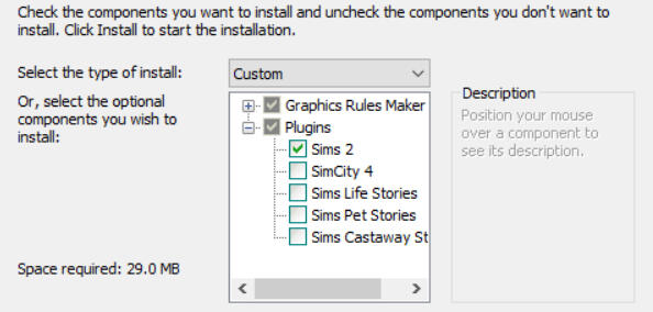If you did not select DXVK and find your game crashing a lot, there are instructions to install it in the "Essential Fixes" section on this carrd. Once you've selected everything, click "Install".The process may take a while and sometimes crashes. If it crashes, simply close the installer with task manager and try again.After it is finished, Graphics Rules Maker can then be installed. Go through the installation steps until you get to the "Choose Components" section.In the “Game” dropdown box, select “The Sims 2". Then go to the "Path" section, and go to "Program Files (x86) / The Sims 2 Starter Pack". It should appear as shown: